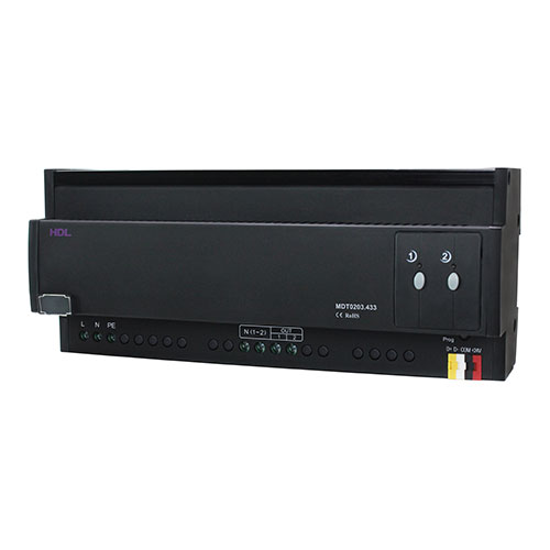2CH 3A Leading Edge or Trailing Edge Universal Dimming Actuator, DIN-Rail Mount, 3A per Channel and Totally 6A, 50-60Hz, 25A TRIAC, Minimum Load 40W,with scene controller and fast replaceable fuse.